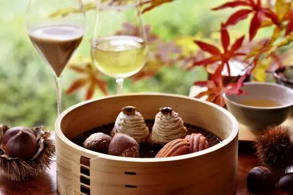 スイーツには、大粒で甘みが強く、しっとりとした味わいの「京丹波栗」を満喫するモンブランやムース、丹波ワインでコンポートした洋梨のケーキ、キャラメルと林檎の自家製マカロンなど、秋の味覚と京丹波の魅力を堪能するメニューが勢揃い。伝統の入れ物「曲げわっぱ」や開化道の菓子缶など、京らしさを感じる風情豊かな器も要チェックだ。
