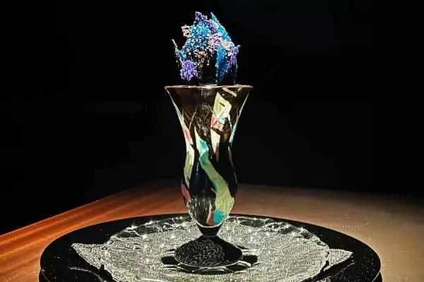ジョウタロウ サイトウ カフェがシーズン毎に展開する、季節の味を用いた見た目も美しい「アートパフェ」シリーズ。新作「マロンショコラのパフェ」は、ブラックショコラを基調に色鮮やかな青や紫、ピンクが覗く、まるで岩肌から天然石が煌めくようなビジュアルが特徴の1品となっている。