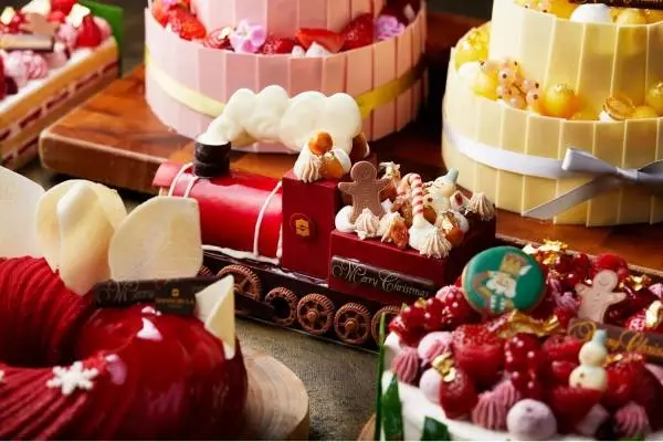 中でも注目は、シャングリ・ラ 東京のブランドキャンペーン「あなたのシャングリ・ラを見つけよう」のキャラクターから着想を得た「クリスマストレインケーキ」。汽車型の真っ赤なボディーは、栗のショートケーキ、パウンドケーキ、栗のムースの3種類を合わせた“栗づくし”の濃厚な味わいに仕上げている。