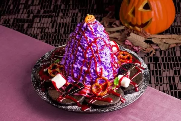 エッグスンシングスのハロウィン限定メニュー、真っ黒ココアパンケーキ×紫いもホイップクリーム