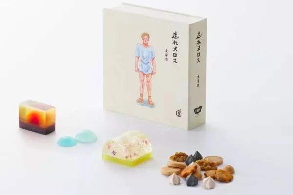ハードカバーの本を模したパッケージを開くと、『走れメロス』が書かれた冊子と4つの和菓子がお出まし。付属の小説を読み進めると登場する色付きの一文にあわせ、ひとつずつ和菓子を楽しんでゆく仕掛けだ。主人公・メロスの激しい怒りや、親友が待つ広場に夕陽が落ちてゆくクライマックスの情景を五感で堪能して。