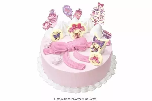 サンリオの人気キャラクター、マイメロディ、クロミのクリスマスアイスクリームケーキは、プレゼントを連想させる大きなリボンのデコレーションがアイキャッチ。ドレスアップしたマイメロディやクロミの装飾に加え、香水瓶、コスメ、ツリーのピックを飾りキュートに仕上げている。フレーバーもマイメロディとクロミをイメージしており、チョコレートとストロベリーのマーブルアイスクリームに、ストロベリーリボンとハート型菓子をミックスした特別なフレーバーを味わえる。