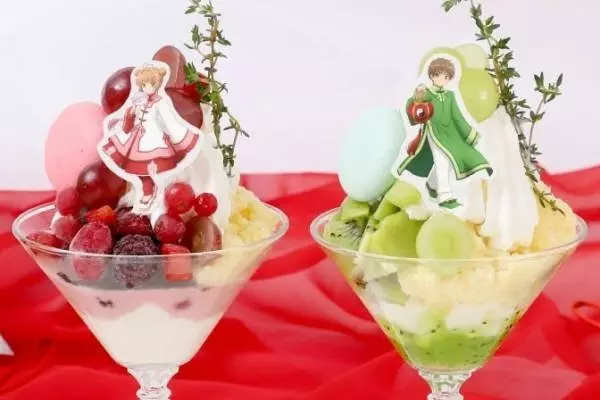 描き下ろしイラストの衣装をモチーフにした2種類のフルーツパフェ「さくら/小狼のフルーツパフェ」や、ボリューム満点の点心「ケロちゃん飯店特製点心セット」、さくらの親友の知世をイメージした「知世のジャスミンティードリンク」など、様々なメニューが楽しめる。