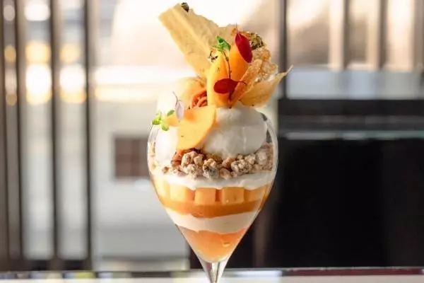 エンポリオ アルマーニ カフェは、2023年11月限定で「柿と栗のパフェ」を展開。フレッシュな柿を主役に、繊細でエレガントな見た目に仕上げている。