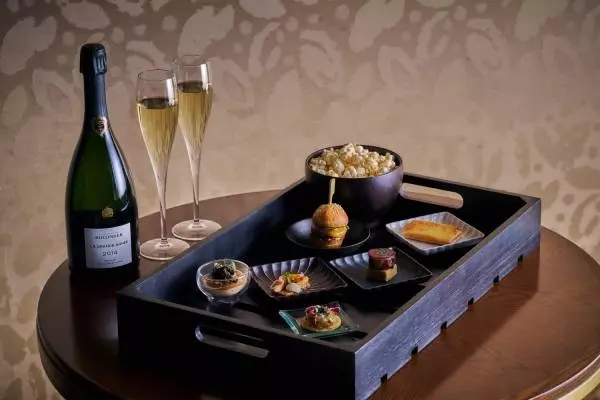 一方、「マンダリンバー」は「モダンジャパニーズ マスカレードパーティー」がテーマのパーティーを開催。ジャズカバーのモダンな生演奏と日本の伝統的な琴の音色が融合した音楽に身を委ねながら、狐のお面を身に着けて一夜限りの仮面舞踏会を楽しめる。プランに応じて、「ルイナール ブラン・ド・ブラン」「クリュッグ グランド キュヴェ」「クリュッグ ロゼ」といったシャンパンのフリーフローも味わうことができる。