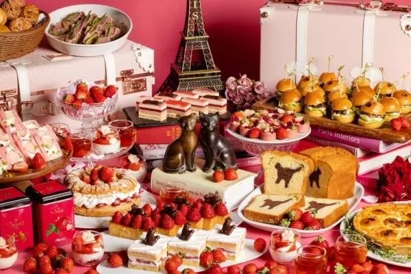 「ラッキーキャット&ストロベリー アフタヌーンティー ブッフェ」は、フランスの老舗紅茶ブランド「ジャンナッツ(JANAT)」とのコラボレーションブッフェ。「ジャンナッツ」のロゴに配された2匹の“幸運の猫”と、あまおうやとちおとめなど"旬のいちご”をテーマにしたスイーツ、セイボリーを多彩なラインナップで用意する。