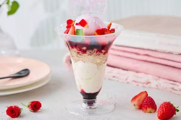 中でも注目は、香り高いバラのアイスをトップに乗せた「シーズナルパフェ~フリュイルージュとバラ香るアイスのパフェ~」。