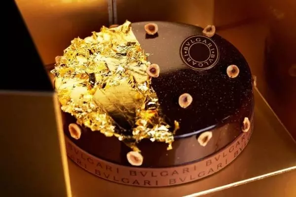 ケーキは、ブルガリで人気のシェフ、ニコ・ロミートによるケーキを、ゴールドが輝く特別なデコレーションで用意。ショートクラストからスポンジ、さくさく食感のペースト、濃厚なクリームやムース、仕上げのグレーズまで、様々な食感とチョコレートの味わい、ヘーゼルナッツの層が織りなす1品となっている。