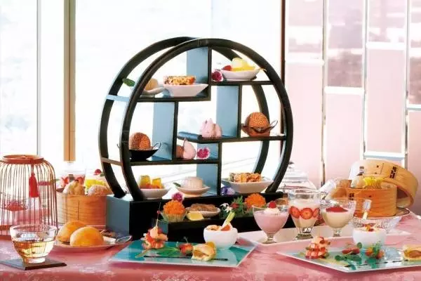 いちご入り胡麻団子 / 赤ウサギのマシュマロ / フルーツ / いちごとパイナップルの水月餅 / ドライいちご入りサチマ / 魚介すり身とモッツァレラチーズのトースト揚げ / ニラ入り焼き餅 / 海老 アボカド レディーサラダ大根のいちごマヨネーズソース / いちごの桂花陳酒シロップ漬けと野菜の甘酢漬け / ローストダックとクリームチーズのチャイナ最中 / 小籠包 トリュフ風味 / 黄皮蒸し餃子 / もち米の焼売 / やまゆりポークのチャーシュー入りメロンパン / いちごプリン / いちごとタピオカ入りココナッツミルク / 杏仁豆腐 いちご添え / いちごアイス