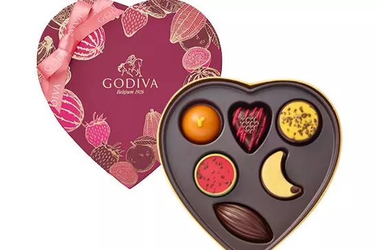 渋谷 東急フードショーでは、バレンタインシーズンにおすすめのチョコレートやスイーツが豊富にラインナップ。まずは、ハートのボックスに入ったゴディバのチョコレートアソートに注目。ストロベリーやバナナ、スイカなどを、ガナッシュやプラリネにしてショコラに合わせた。フルーツをモチーフにした、キュートな見た目も魅力だ。