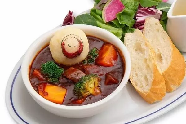 注目は、目玉おやじが“ビーフシチューの茶碗風呂”にゆったりと浸かっているプレート。柔らかな牛肉に赤ワインとデミグラスソースを加え、濃厚なシチューに仕上げた。