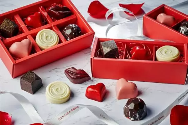 2023年7月に開業したタイ発の高級ホテル・センタラグランドホテル大阪が贈るバレンタイン限定スイーツの中でも注目は、フランス・ヴァローナ社の上質なチョコレートを使用したボンボンショコラ。真っ赤なハート型やリップ型、ホテルを象徴するロゴ入りなど、バレンタイン気分を盛り上げる個性豊かなビジュアルに仕上げている。
