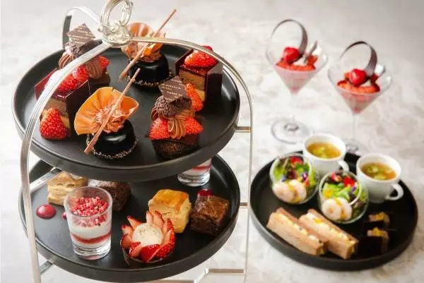 チョコレートの黒といちごの赤を基調にしたアフタヌーンティーでは、有名ショコラティエ・ピエール マルコリーニのクーベルチュールを使い、ザ・プリンス パークタワー東京のホテルオリジナルレシピで作ったスイーツやセイボリーを用意。ピエール マルコリーニの味わい深いチョコレートと甘酸っぱいいちごの組み合わせを楽しめる。