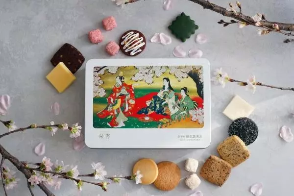 デザインは、ホテル内の東京都指定有形文化財「百段階段」の1室である漁樵の間の壁画をモチーフに。人々が桜を愛でる優美な姿を描いたクッキー缶は、感謝の贈り物や春の行事にもぴったりな1品に仕上がっている。