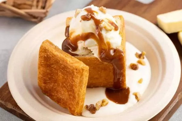 新たにスイーツメニューに加わる「クルミッ子デニッシュトースト」は、「クルミッ子」を包んだデニッシュを、さっくりもちっと食感にトーストした1品。バターとキャラメルの風味、クルミの香ばしさが口いっぱいに広がる濃厚な味わいに仕上げた。