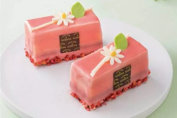 アトリエ ドゥ ゴディバ(GODIVA)からは、華やかなピンク色をまとった「スプリング ストロベリー」が登場。ストロベリームース、抹茶ビスキュイ、ホワイトチョコレートガナッシュの層から成り、甘酸っぱくもミルキーな味わいを楽しむことができる。
