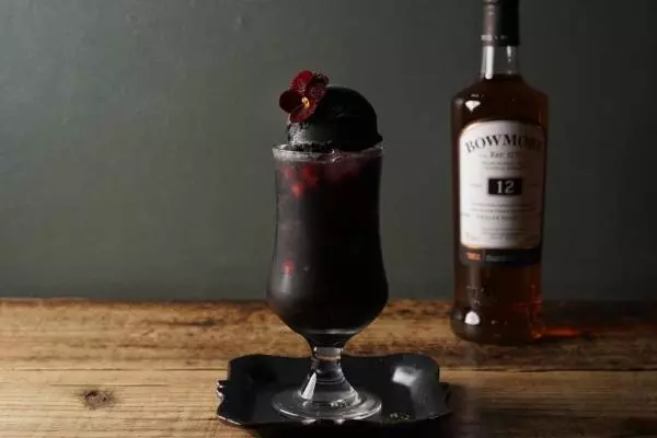 ベースとなるのは、ベリーの甘酸っぱいソーダ。ほんのり香るローズと、スモーキーな味わいが特徴のウイスキー・アイラモルトを合わせ、大人な味わいに。トップには、デンマーク産の泥炭(ピート)をはじめとする天然の色素で色付けした“真っ黒”なバニラアイスをあしらった。仕上げに、黒に映えるビオラの花びらと、味のアクセントとしてピンクペッパーを散りばめ、プレミアムな1杯に仕上げている。