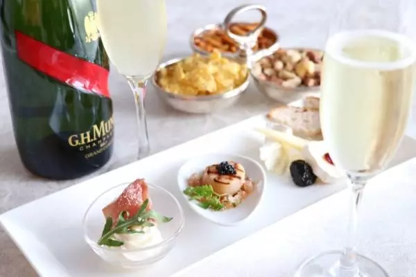 内容:シャンパンフルボトル 2名様ごとに1本、フリーフロードリンク(赤ワイン、白ワイン、ハイボール、カクテル&モクテル50種、ソフトドリンク)、フード(アペタイザー3種、スナック3種)
