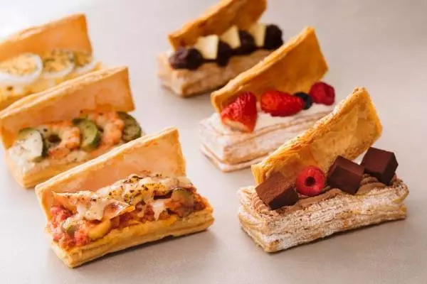 中でも注目は、まるでコッペパンのように、パイ生地の間に具材を挟んだ「コッペパイ」。国産バターをたっぷり用いてサクサクに焼きあげたパイ生地に、甘いフルーツやあんバター、チョコクリームなどと組み合わせたデザートタイプと、ソーセージや野菜などと組み合わせた塩味タイプを用意する。