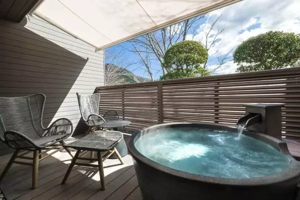 温泉露天風呂付き客室は、箱根の自然を臨めるテラスに信楽焼の浴槽を設置。箱根十七湯のひとつ「宮城野温泉」を自家源泉より引湯しており、身体の芯からポカポカに温め、身体をほぐしてくれる。