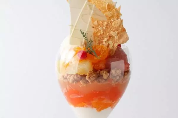 グラスには、“ザクザク”食感のクランブル、酸味の効いたニューサマーオレンジのクリームとゼリー、そしてカンパリオレンジゼリーの層を重ね、多彩なフレーバーと食感を楽しめる仕上がりに。最後はコクのあるビアンコマンジャーレが、まろやかに後味を彩る。