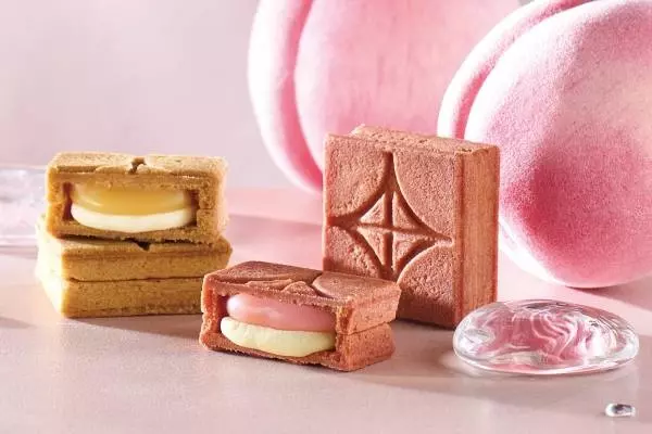 「バターサンド〈桃〉」は、濃厚な桃ガナッシュと、果⾁感のある桃ジャムを練り込んだコク深い桃バタークリームを、サクサク⾷感のクッキー⽣地で2層にサンド。かじった瞬間に桃がふわりと⾹り、桃そのものを⾷べているような凝縮した味わいが⼝いっぱいに広がる1品だ。