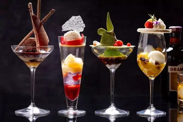 ヒルトン東京が提供するのは、1日の終わりに味わうバー限定の「夜パフェ」。ウイスキーやカクテルとの相性にも優れた4種類のパフェを用意する。