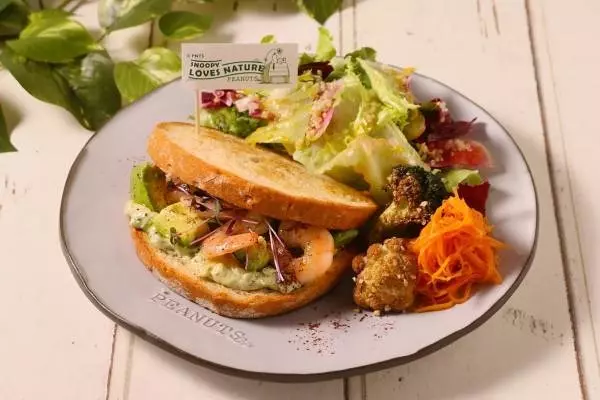 ピーナッツ カフェが今回展開するのは、「SNOOPY Loves NATURE」と題した“自然”を感じる限定メニューやグッズの数々。まず注目したいのは「シュリンプとアボカドの石窯カンパーニュサンドプレート」だ。エビとアボカドをバジルの効いた自家製タルタルソースでマリネし、カンパーニュで挟んだ。そこに、ボリュームのあるサラダと野菜のデリを添え、食べ応えのあるプレートに仕上げている。