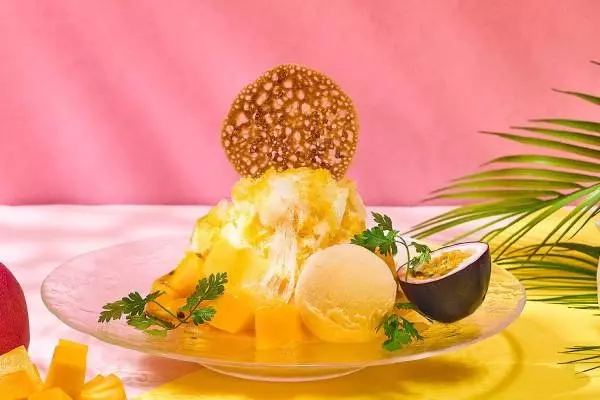 中でも注目は、沖縄県産の完熟マンゴーと爽やかな酸味のパッションフルーツを堪能できる「ジューシーマンゴー&パッションフルーツかき氷」。氷は、マンゴーシロップと練乳をかけながら削ることで、濃厚な甘みを閉じ込めて。マンゴーのごろっとした果肉とパッションフルーツのアイスを加え、見た目も味も南国感あふれるかき氷に仕上げた。