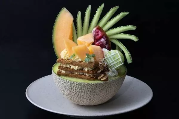 2024年の夏に登場する新スイーツは、メロン半玉を贅沢に用いたパフェ「まるごとメロンのスペシャルパフェ」。フレッシュでみずみずしいメロンの半玉を器に、キャラメリゼした自家製メロンミルフィーユや、メロンとフランボワーズのタルト、シャーベットなどのメロンスイーツを大胆にトッピングした。