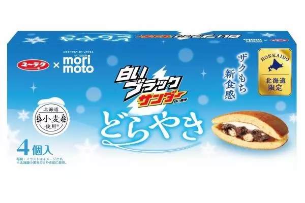 ザクザクと楽しい食感で人気を博す菓子「ブラックサンダー」の北海道エリア限定となる「白いブラックサンダー」は、北海道ミルクを使用したホワイトチョコレートコーティングが特徴だ。そんな「白いブラックサンダー」が、北海道を代表するスイーツブランド「もりもと」とタッグを組み新たな土産スイーツを開発。「もりもと」を象徴する和菓子“どら焼き”と融合させた、新たな北海道土産スイーツだ。