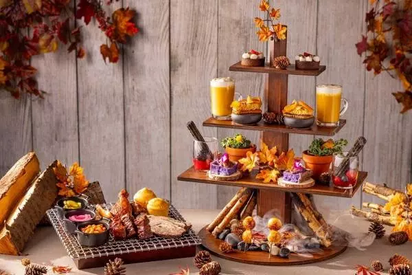 メインの肉料理のほか、サイドディッシュやスイーツを揃える「秋のスモーキーお肉アフタヌーン」。キャンプファイヤーのような薪を飾り付けた木製ティースタンドとともに、フォトジェニックなアフタヌーンティーを楽しむことができる。