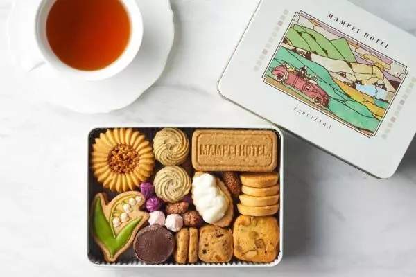 そんな「万平ホテル」のソフトオープンを記念した「万平ホテルプレミアムクッキー缶」には、芳ばしいバターが香る11種類のクッキーをセット。万平ホテルのシンボルで“幸せの訪れ”の花言葉を持つ“すずらん”を模した「すずらんクッキー」、アルプス館正面にホテル創業当時から飾られている看板をモチーフにしたコーヒー味の「看板クッキー」などを詰合わせている。