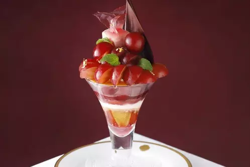 “ルビーロマン”は、まるでルビーのように鮮やかで大ぶりな果肉と、たっぷりの果汁、爽やかな甘さが特徴の石川県産のブランド葡萄だ。限定パフェには、果実だけでなくゼリーやソース、シャーベットにまで旬の“ルビーロマン”を贅沢に使用。みずみずしい果実とフルーツが織りなすリッチな味わいを堪能できる。