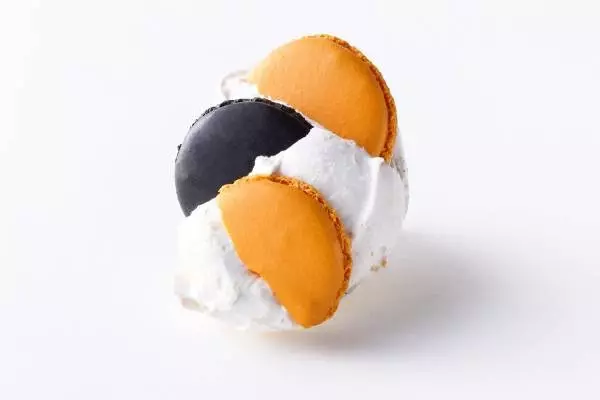 たとえば、Made in ピエール・エルメの定番人気のメレンゲは、ハロウィンを思わせる鮮やかなカラーを纏って登場。アーモンドがたっぷり入ったさくさく食感のメレンゲに、ブラックとオレンジのマカロンコックをトッピングした。