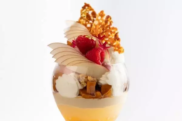 パフェの主役は、さっぱりとした紅玉リンゴのソルベと、スパイシーなカルダモンが隠し味のフロマージュのジェラート。カリカリ食感の胡桃とチーズのクランブルやキャラメリゼされたシャキッとした食感の紅玉リンゴと組み合わせることで、食感と味わいの変化を楽しめる1品に仕上げた。