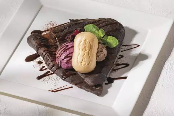 群馬県富岡市観光協会とのコラボレーションで誕生した大宮店限定の「桑の実バタークリームとチョコレートムースのクレープ」は、地元富岡の銘菓店・田島屋の「桑の実ピューレ」と「まゆくわ最中」を贅沢に使用したクレープ。
