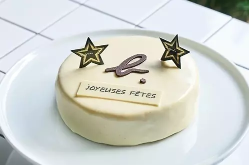 ケーキ表面には、アニエスベーの“b.”アイコンや、アイコニックなモチーフの1つ、エトワール(星)のデコレーションを施し、クリスマス気分が高まるビジュアルに仕上げた。