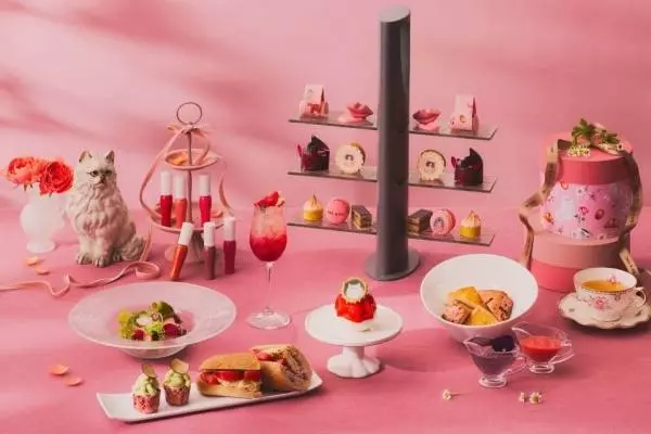 「ストロベリーアフタヌーンティー インスパイアド by ポール & ジョー」は、“猫モチーフ”などかわいいコスメを展開するポール & ジョー ボーテの世界観に着想を得たアフタヌーンティー。ポール & ジョーのデザイナー、ソフィーの愛猫をはじめとする、ブランドのアイコニックなモチーフを落とし込んだスイーツの数々を揃える。