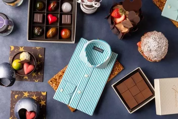 目を惹くのは、本物と見紛うほど精巧な作りの「ドレスシャツ チョコレート」。ボタンの縫い目や襟の細部まで、忠実に再現している。ホワイトチョコレートをベースにしており、土台にはキャラメリゼしたカリカリ食感のナッツとビターチョコレートを合わせた「フィオレンティーナ」を敷いている。ライトブルーの無地と、ストライプの2種類が揃うので、いつも仕事を頑張っているお父さんや恋人へのギフトにもおすすめとなっている。