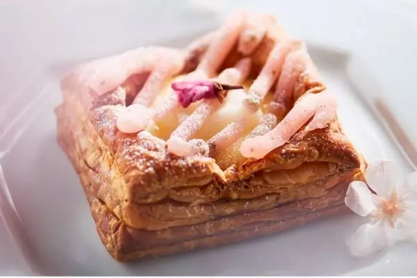 「焼き立てオープンパイ〔桜もち〕」は、サクサクのパイ生地に自家製チーズカスタードクリームと求肥を重ね、桜葉入り餡をたっぷり絞った1品だ。クリームチーズとサワークリームで仕立てたチーズクリームが、爽やかな味わいを引き立てる。仕上げに桜の風味がほんのり香る桜花をトッピングした。