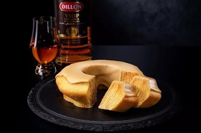 ねんりん家の新作「熟成ラムバター ~ディロンラムを染み込ませて~」は、ラム酒をふんだんに使用した大人の味わいのバームクーヘン。濃厚なバター風味のねんりん家の代表商品「マウントバーム しっかり芽」をベースに、やわらかく奥深い風味が特徴のフランス産「ディロンラム」をじゅわっと染み込ませた。