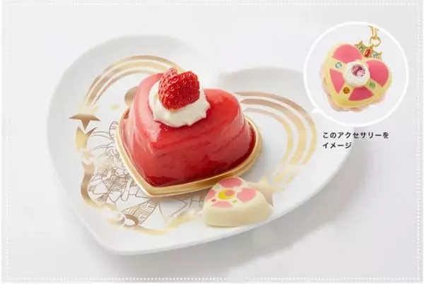 「コズミックハートマカロン プレート」はコンパクトを開けたところをイメージしたムースケーキに、コンパクトが描かれたホワイトショコラが添えられた。ケーキのホイップにはハート型のストロベリーがのっている。また、描きおろしアートが描かれた陶器のハート型プレートは持ち帰りが可能。