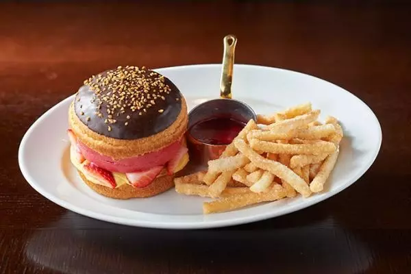 注目は、6階ステーキハウス「オーク ドア」で展開される「アイスバーガー」。チョコレートをコーティングしたブリオッシュで、ラズベリーアイスとフルーツをサンド。モチモチのバンズと冷たいアイスのコントラストが楽しめる新感覚スイーツだ。
