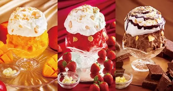 新登場する3種のフレーバーは、「贅沢いちご」「ごろごろマンゴー」「濃厚チョコレート」。いちごとマンゴーは果実感のある濃厚な蜜をたっぷりとかけ、フルーティな美味しさに。チョコはトロリとして深い味わいながらも清涼感のある美味しさに仕上げている。