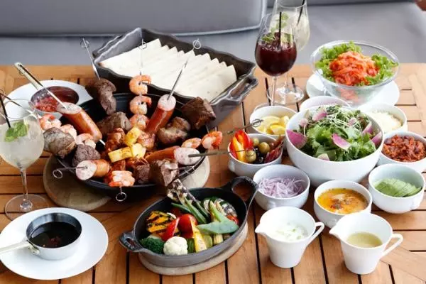 開放的なテラス席で、スパイスを大胆に効かせた肉料理と種類豊富なドリンクを飲み放題で楽しめる本プラン。今回はカジュアルでアットホームな「夏のギャザリング」をテーマに、親しい仲間と分け合えるボリューム満点の美味しい料理がラインナップ。タンドリーチキンや、仔羊肩肉のロースト、エビのプランチャ焼きといったメイン料理の他、夏野菜を香ばしく焼き上げた大皿料理、フムスやチリコンカンなどバラエティ豊かな料理を堪能できる。