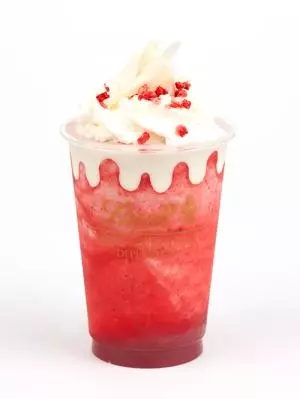 「ホワイトチョコレートストロベリーアイスドリンク」は、ミルキーなまろやかさと、すっきりとした後味が特長的なホワイトチョコレートに、甘酸っぱいストロベリーを合わせた毎年人気のドリンク。ホワイトチョコレートに、丸ごとすりつぶしたストロベリーの果肉と果汁、練乳を加え、ホワイトチョコレートのやさしい甘さとストロベリーの酸味のバランスが絶妙な味わいの一品だ。
