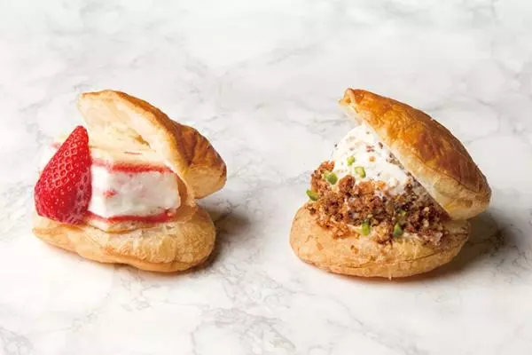 「ストロベリーショートケーキ」は、サンドしたショートケーキ風のアイスクリームとサクサクの生地とのマリアージュが病みつきになる一品。スポンジ、苺ソース、バニラアイスからなる三重構造のアイスクリームと、ちょこんと添えたフローズンストロベリーの愛らしい見た目にも心奪われる。