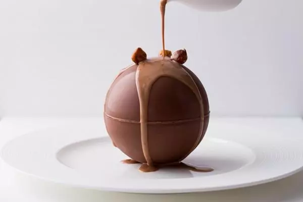 球体型のチョコレートに、注文者の目の前で暖かいソースをかけて完成する、チョコレート尽くしの一品。ヘーゼルナッツの香りがミルクチョコレートの味わいを引き立て、程よいバランスを生んでいる。