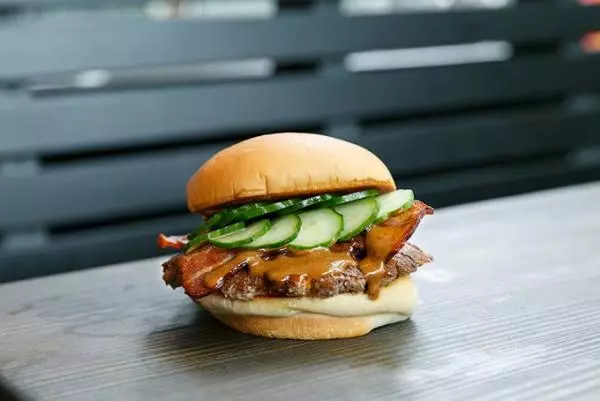 「デン シャック」は、ジューシーなアンガスビーフ100%のパティの上にアップルウッドでスモークしたベーコンをのせ、きゅうり マリネをトッピング。そしてポテトバンズではさんだ。たっぷりの特製ソースは、バーガー全種類に使用しているシャックソースに、卵黄やみりん、酒などと共に練った「傳」の赤味噌を合わせ、香りのよい山椒の粒を混ぜ込んでいる。甘みとコクのあるソースだ。